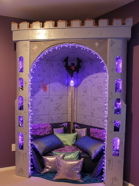 A Cozy Castle Reading Tower transforms a child’s reading nook into an enchanted medieval space. With stone-textured walls, an arched doorway entrance with a drawbridge curtain, and ambient sconce lighting, the tower creates an immersive setting for young readers.