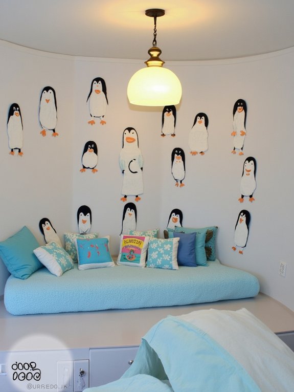 The Penguin Palace Play Zone transforms a toddler’s room into an Antarctic wonderland through cool blues, pristine whites, and penguin-themed elements. The design creates an immersive polar environment that encourages imaginative play and exploration.