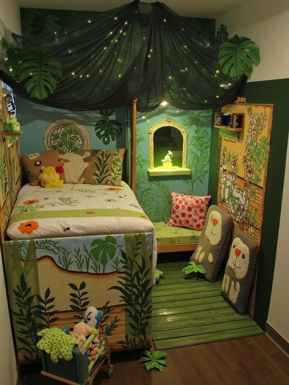 The atmosphere comes to life through strategic elements like suspended mosquito netting around the bed, soft nature sounds, and lighting that creates dappled sunlight effects through the leafy canopy. These features work together to create an authentic rainforest environment that encourages imaginative play and adventure.