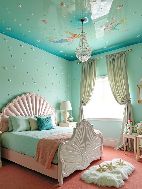 The design incorporates practical features like shell-shaped reading nooks, pearl-accented pillows, and sea-themed storage solutions with starfish handles and coral motifs. Shimmering mermaid tail blankets and soft LED lighting complete the dreamy underwater atmosphere, making bedtime an enchanting experience for young children.