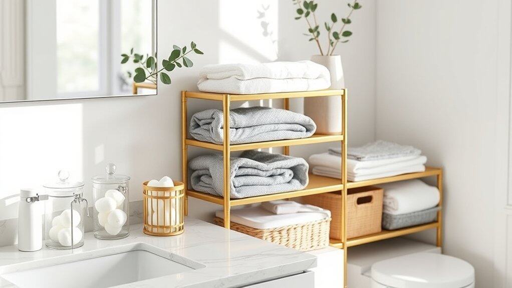 By implementing floating shelves strategically, you can transform cluttered counter spaces into an organized, aesthetically pleasing display area. These versatile installations allow for customizable storage solutions that adapt to your specific needs while maintaining a clean, minimalist appearance that enhances your bathroom’s overall design.