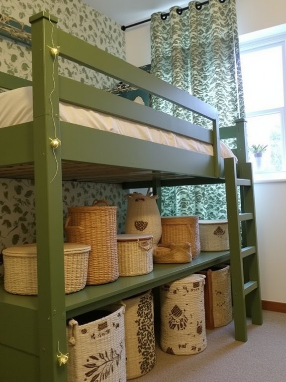 Three key storage options enhance the forest ambiance: large wicker trunks with leather straps for bedding storage, natural fiber wall baskets for displaying small treasures, and bamboo under-bed rolling baskets with forest-green liners. These practical elements maintain the enchanted forest atmosphere while effectively managing clutter and keeping spaces organized.