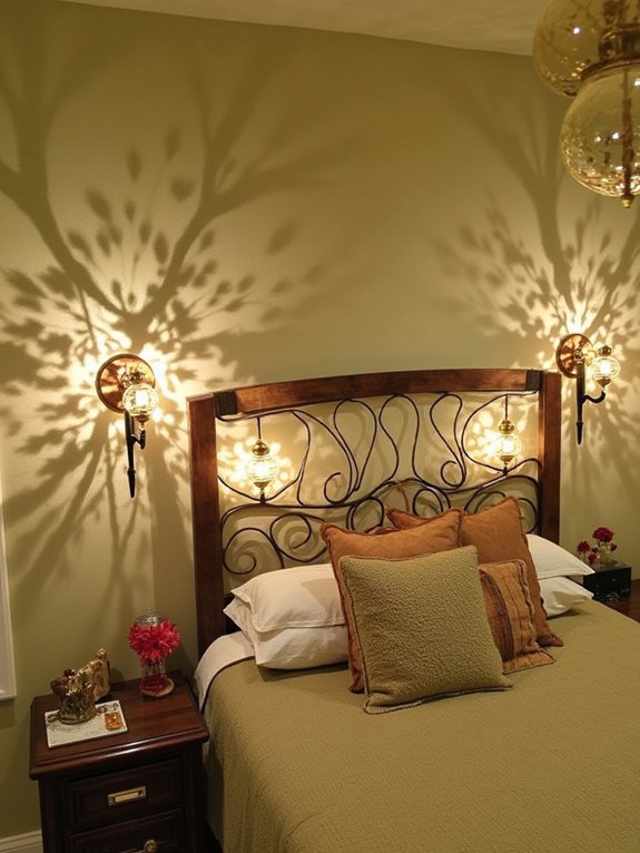 When choosing forest lanterns, select styles that feature black metal or bronze finishes, often adorned with nature-inspired designs like leaves and branches. Battery-operated LED options with flickering flame effects provide a safe alternative to real candles, while frosted glass panels create a soft, moonlit ambiance. Install sconces 60-66 inches from the floor for optimal lighting distribution throughout your space.