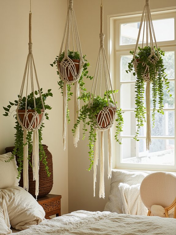 Macramé plant hangers offer an artistic and space-efficient way to display greenery in bedroom settings. These woven rope creations suspend plants from ceiling or wall mounts, adding natural texture and bohemian flair while keeping floor space open.