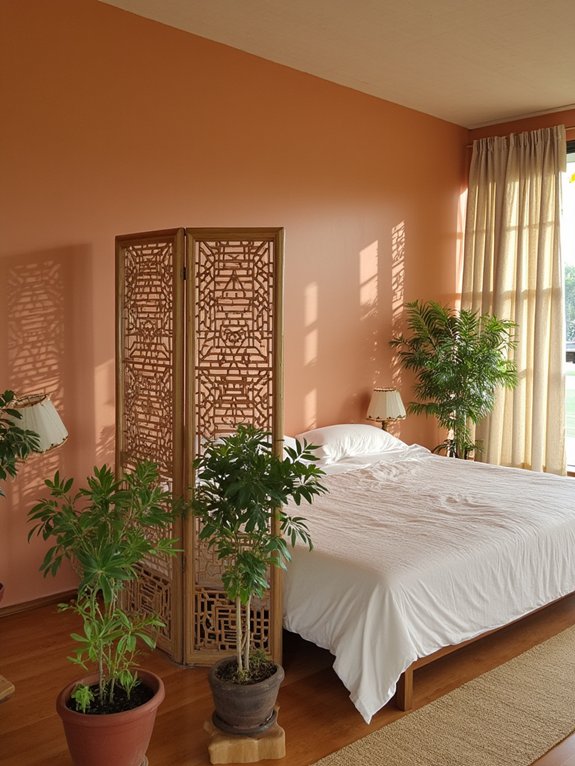 Bamboo room divider screens offer an elegant way to create distinct spaces within a bedroom while maintaining a natural, peaceful aesthetic. These sustainable screens, typically 6 feet tall with folding panels, can effectively section off areas for work or dressing while filtering light and adding visual texture.