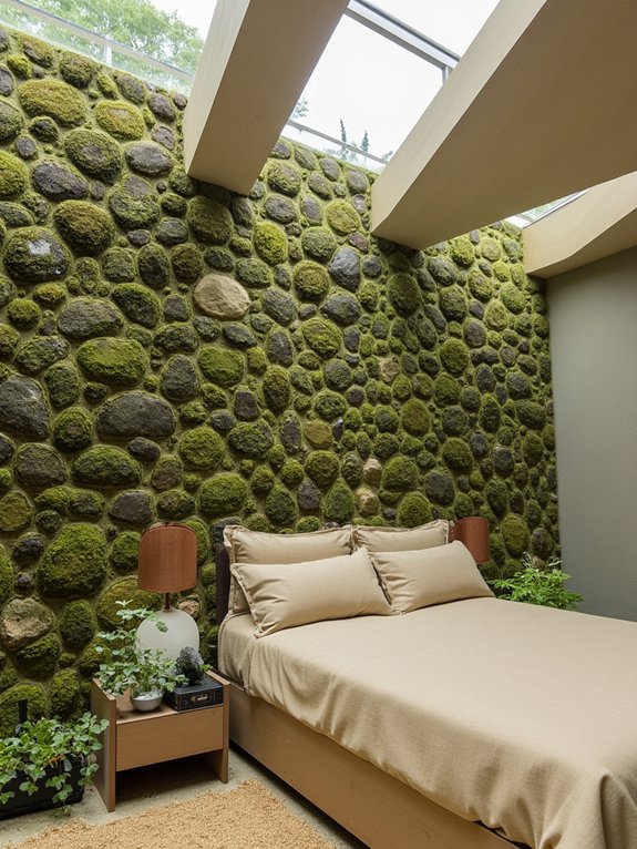 A mossy rock wall display creates a stunning natural accent by combining flat river rocks with preserved moss varieties. This unique indoor feature mounts directly to the wall using mesh backing and secure anchors, transforming any bedroom into a forest-inspired retreat.