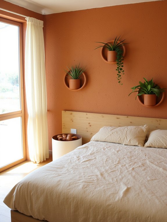 Clay wall planters combine natural earthenware with vertical gardening to create living wall art in bedrooms. These decorative vessels feature terracotta’s inherent moisture control while adding organic textures and air-purifying greenery to vertical spaces.