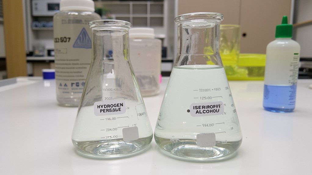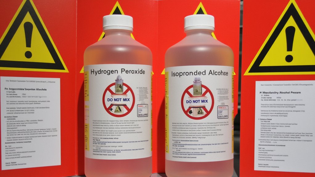 You might be tempted to mix hydrogen peroxide and isopropyl alcohol for enhanced cleaning power, but this combination poses serious risks. The chemicals react quickly to form peracetic acid, a hazardous substance that can cause severe burns and respiratory distress. Before you reach for these common household items, it’s essential to understand why mixing them creates dangerous results and what safer alternatives exist for your cleaning needs.