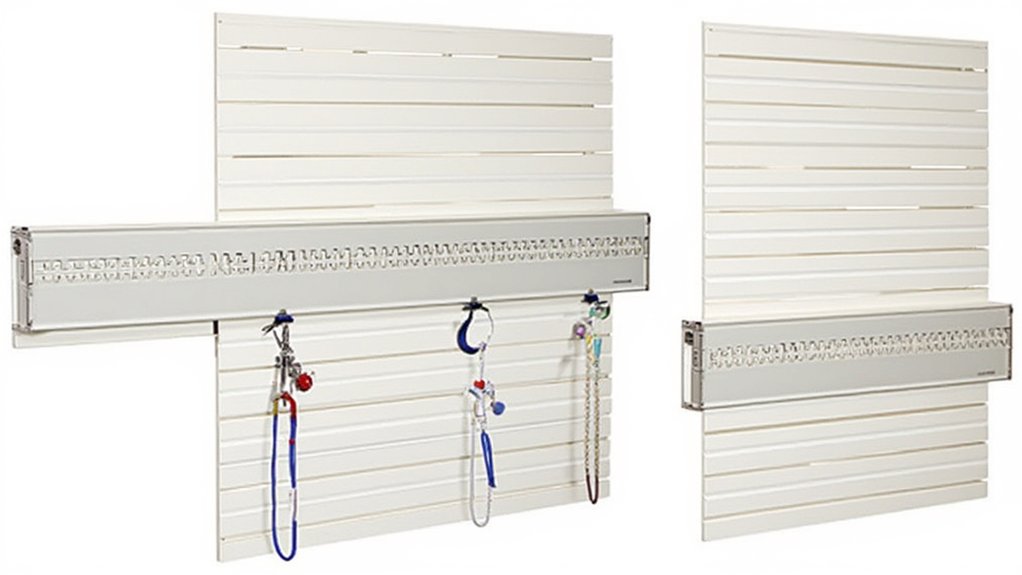 The design variations create distinct installation challenges. You’ll need to locate wall studs precisely for FastTrack’s rail system, which typically takes 30-45 minutes to install properly. “FastTrack’s singular rail mounting creates a more forgiving installation process,” notes contractor Mike Reynolds. In contrast, Slatwall requires careful panel alignment and often needs shimming to guarantee perfectly level surfaces. A standard 4×8 foot Slatwall panel installation usually takes 1-2 hours and demands more precise cutting around outlets and corners.