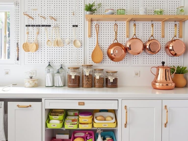 For ideal organization, group similar items together and position them near their primary use area. This approach streamlines cooking tasks while maintaining a tidy, functional kitchen environment.