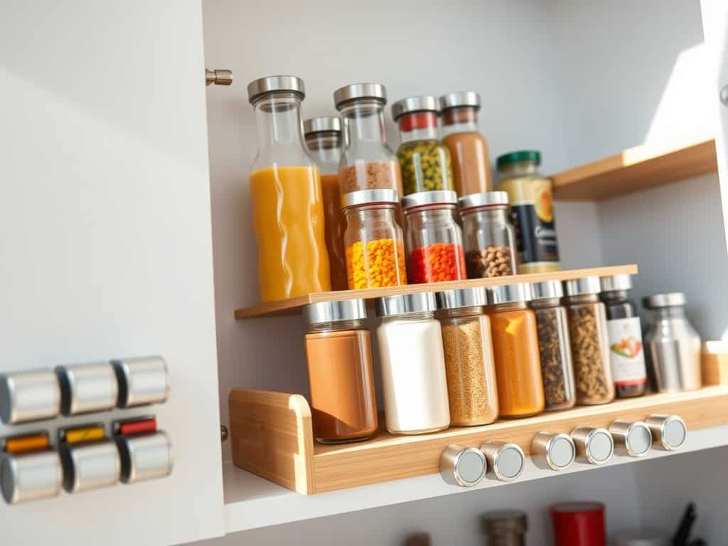Expandable shelf risers are game-changers in condiment organization, creating multiple vertical levels that transform cluttered cabinets into efficient storage spaces. These adjustable platforms ensure that every bottle and jar is visible and accessible, eliminating the need to move multiple items to reach what you need.