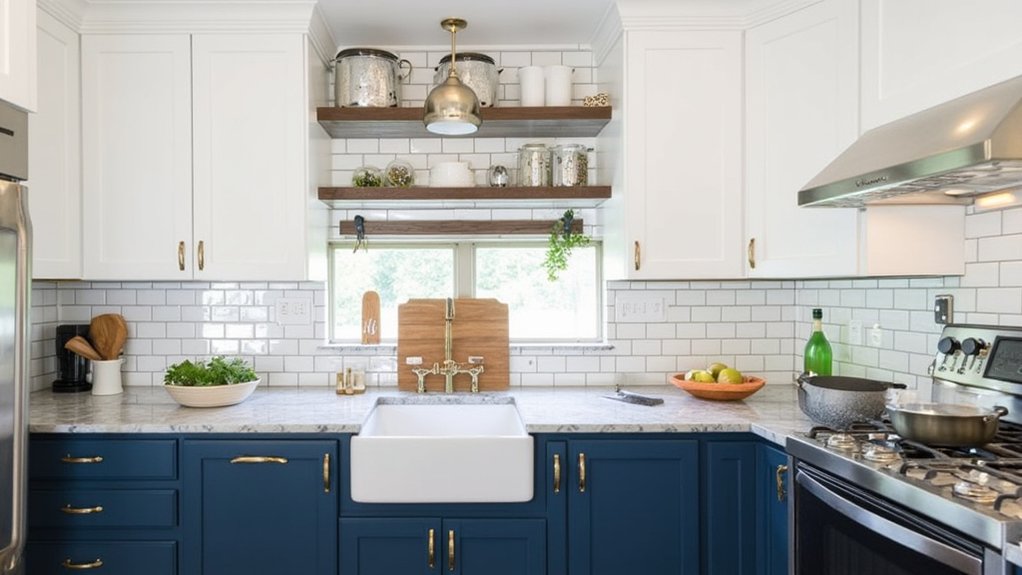 While the one-wall kitchen works for tight spaces, a corner kitchen configuration offers a smart way to utilize tricky angles. You’ll maximize every inch by placing cabinets and appliances along two connecting walls, often in a 90-degree setup. This layout, typically 8×8 feet, boosts storage and counter space within 10-12 feet of workflow.