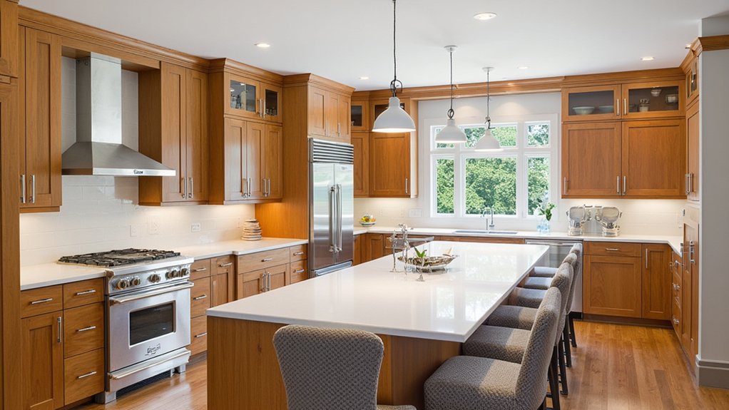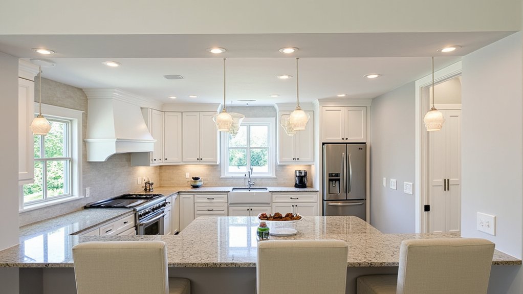 If you’re looking to create a spacious and inviting kitchen, consider an open-concept kitchen design that connects seamlessly with your living or dining areas. This layout breaks down walls, often expanding your space by 200-300 square feet, making it feel airy. You’ll love hosting in this setup!