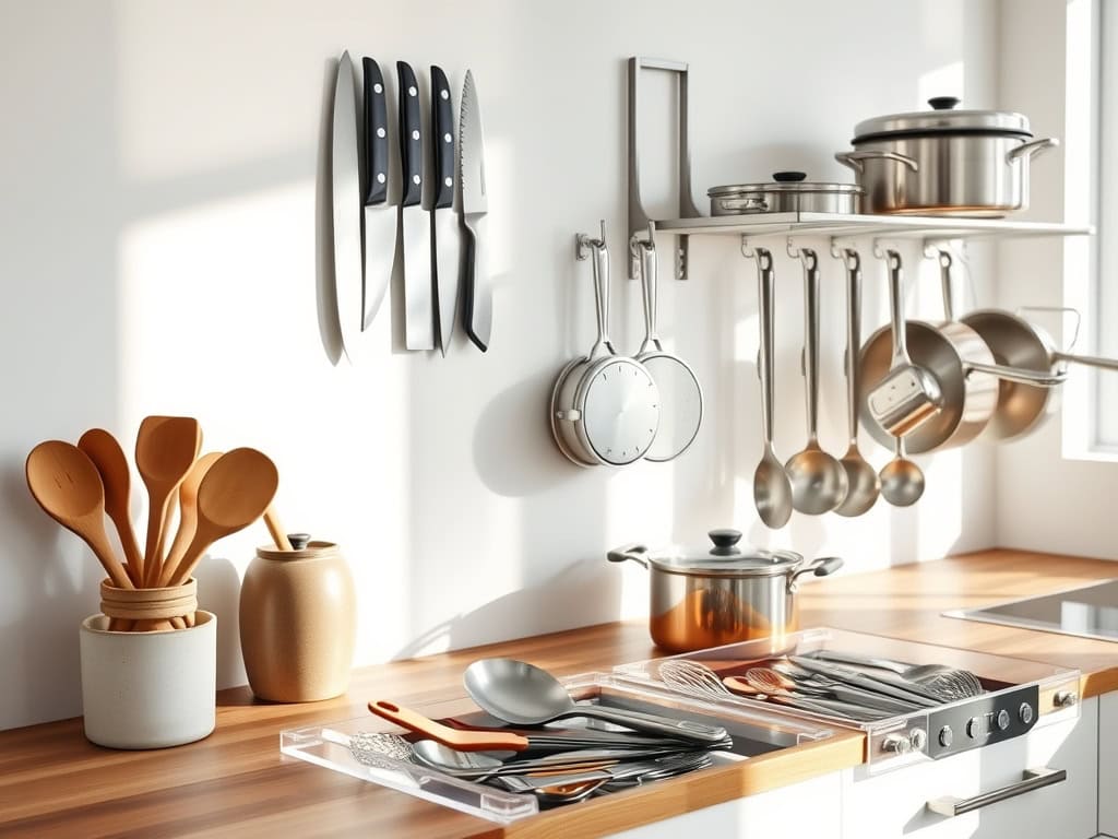 Wall-mounted storage solutions are game-changers for kitchen organization, transforming unused vertical space into functional storage areas. By getting utensils off countertops and onto walls, you create more workspace while keeping frequently used tools within easy reach.