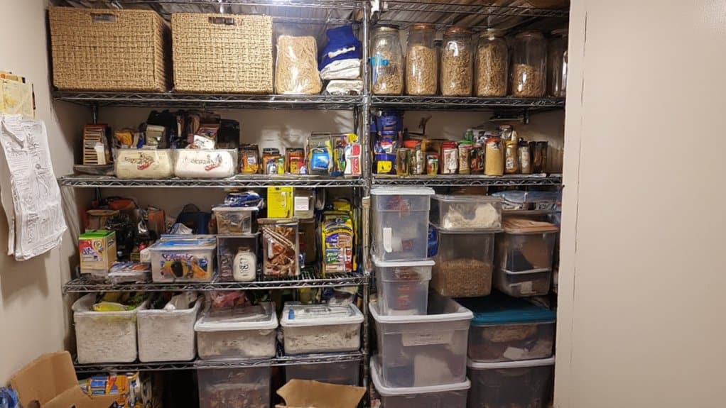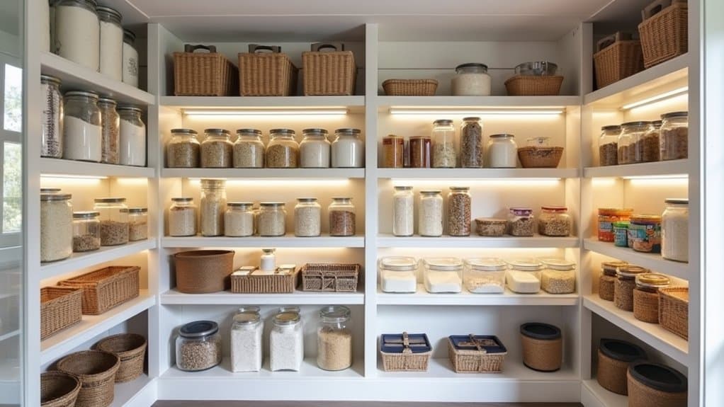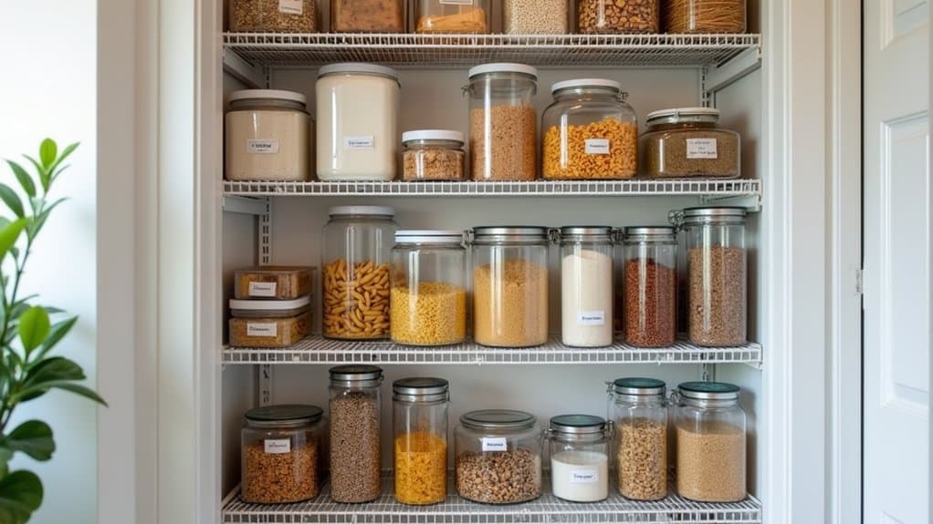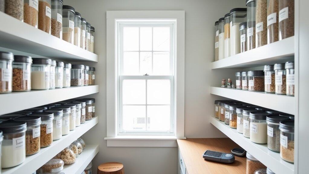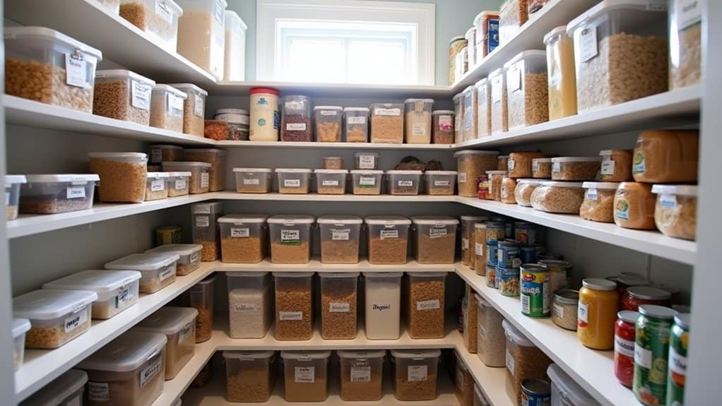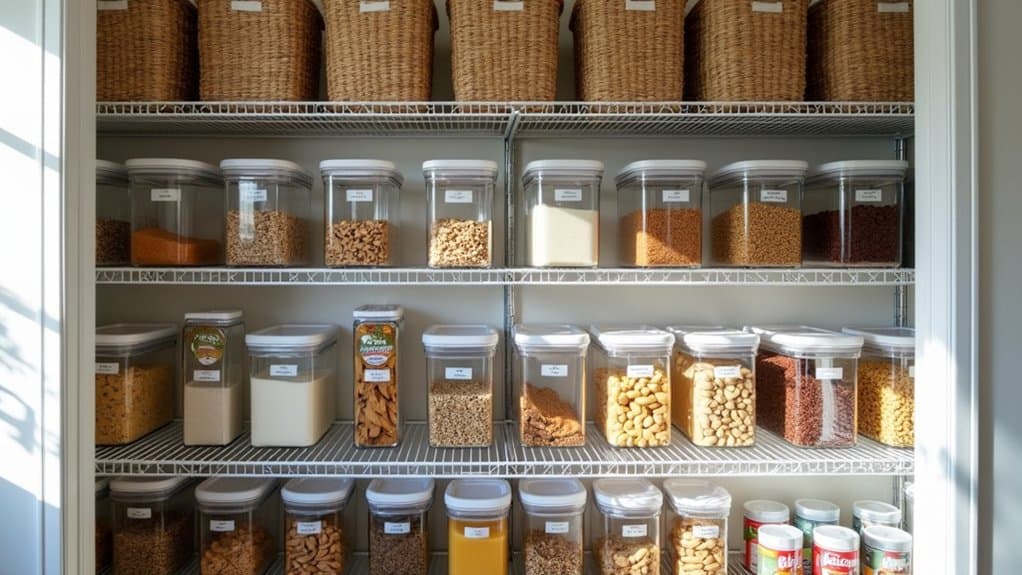To make the zoning system even more efficient, use storage containers or baskets within each zone to further organize smaller items like spice packets, granola bars, or individual snack packs. Place these containers in a way that maximizes space, such as stacking them or using shelf risers to create additional levels. Guarantee that zones are flexible enough to accommodate seasonal items or bulk purchases by leaving some extra space or using adjustable shelving. Regularly review and reorganize these zones to account for changing family needs or new food preferences, keeping the pantry functional and clutter-free.