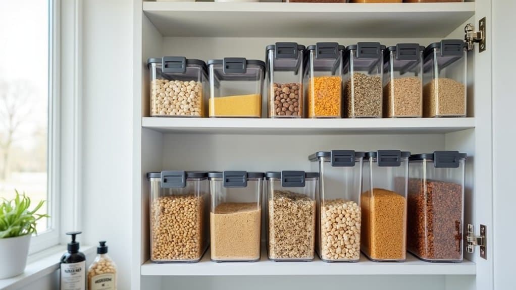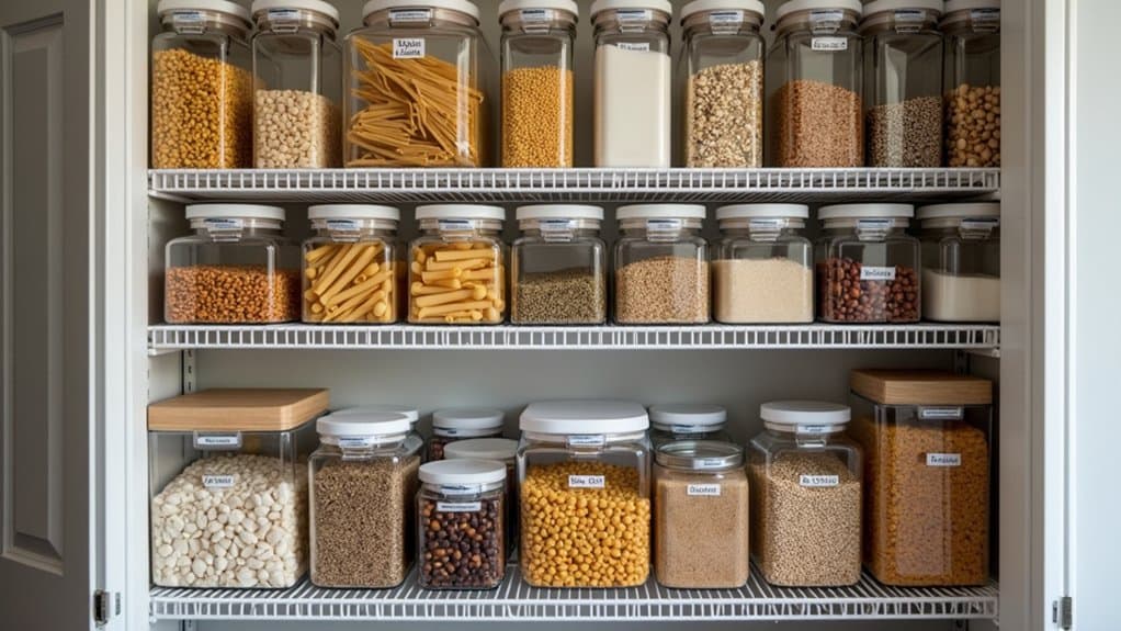 When organizing with clear containers, start by decanting items from their original packaging into labeled containers for a uniform look and easy identification. Group similar items together—such as all baking essentials or snack foods—to create designated zones within your pantry. This approach not only streamlines meal prep but also helps family members quickly find what they need without creating chaos. Finally, place frequently used items at eye level for convenience, while storing less-used items on higher or lower shelves to maintain an efficient layout.