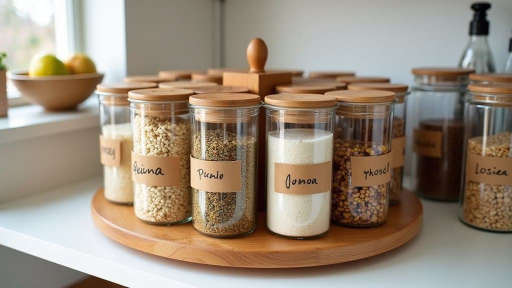Consistency in rotating stock also helps maintain an organized pantry that prevents clutter from accumulating. Set a routine schedule, such as a brief reorganization each time you restock groceries, to keep the system running smoothly. Label shelves or containers with categories like “canned goods” or “snacks” to quickly identify where items belong during restocking. Additionally, consider using clear storage containers or lazy Susans for bulk items like cereal or pasta, as they make it easier to see quantities and rotate stock without digging through clutter. This practice not only keeps your pantry tidy but also guarantees that your family always has fresh, safe food on hand.