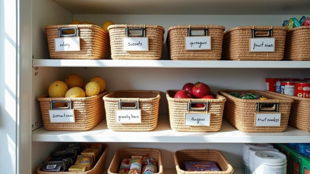 Baskets are an excellent solution for organizing smaller bulk items in a family pantry, keeping things tidy and accessible. Start by grouping similar items, such as snack packs, granola bars, or individually wrapped treats, into designated baskets based on category or family member. Label each basket clearly with tags or stickers to guarantee everyone knows what belongs where, reducing the chances of misplaced items. Place these baskets on lower shelves or in easy-to-reach spots, especially if kids will be grabbing their own snacks.