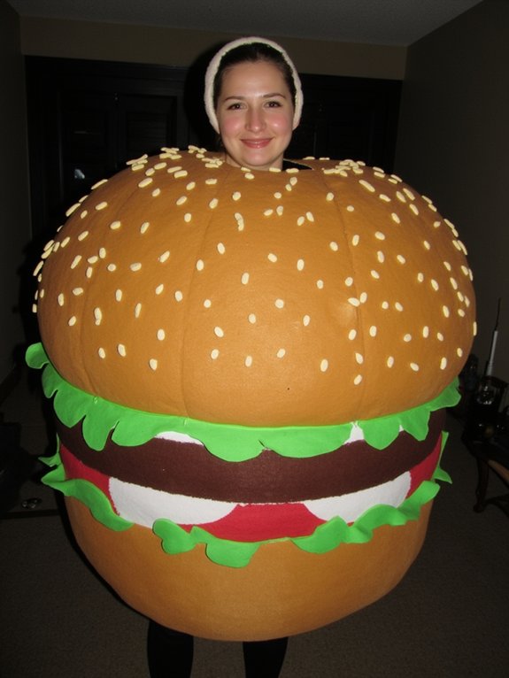 To create a burger costume, you’ll need brown felt for the buns, dark brown fabric for the patty, and white felt for sesame seeds. The main components are constructed from circular fabric pieces – two 30-inch brown circles for the buns and a 28-inch dark brown circle for the patty.