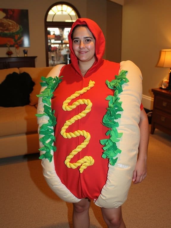 Transform into a classic ballpark hot dog with a simple yet eye-catching costume design. A brown or tan bodysuit serves as the bun, while a red foam cylinder wrapped around the torso creates the hot dog itself. Top it off with yellow, white, and green felt pieces to represent classic condiments like mustard, onions, and relish.