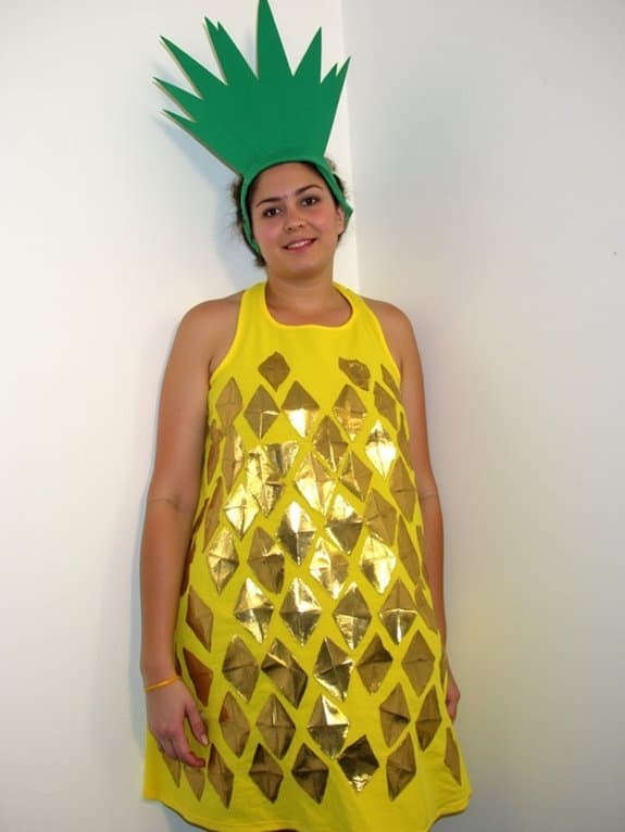 Transform into a cheerful tropical fruit by creating a DIY pineapple costume using a yellow dress as your foundation. The costume’s distinctive texture comes from brown felt diamonds attached in overlapping rows across the dress, mimicking a pineapple’s natural pattern.