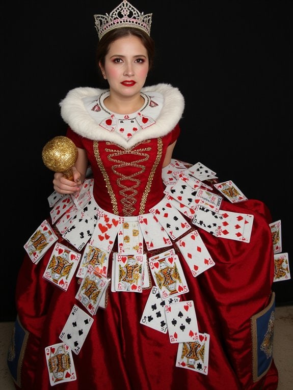 Transform into the Queen of Hearts with a striking costume built around playing cards. Starting with a red dress as the foundation, the defining feature is a dramatic collar created from playing cards arranged in a fan pattern on a wire frame, topped with a card-decorated crown.