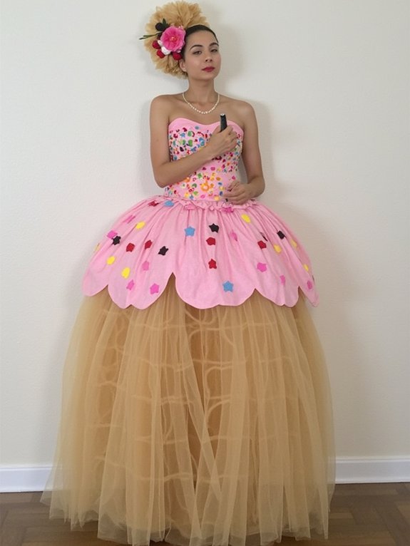 Complete the look with a cherry-on-top headpiece made from red foam sheets attached to a headband. The costume requires a base dress, felt circles in various colors, brown foam sheets for the chocolate drips, and red foam for the cherry hat.