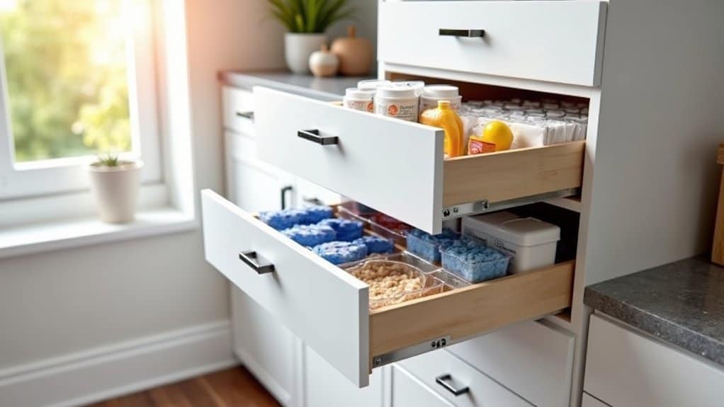Start by measuring the interior of your cabinets to guarantee a proper fit, then install the trays following the manufacturer’s instructions, securing the hardware firmly to avoid wobbling. Label each tray for specific items to maintain order and guarantee everything has a designated spot. Regularly check and reorganize the trays to prevent clutter from building up again, keeping your laundry room functional and tidy.