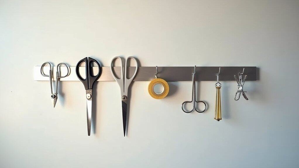 Mounting magnetic strips in your laundry room is a clever way to keep small metal items like scissors, pins, and clips organized and easily accessible. Start by selecting a convenient spot on the wall or inside a cabinet door where the strip won’t interfere with other tasks. Use a level to guarantee the strip is straight, then secure it with screws or strong adhesive, following the manufacturer’s instructions for a firm hold.