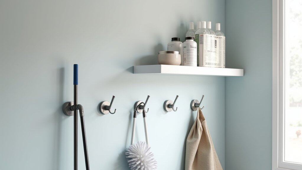 To maximize their utility, position the hooks at varying heights to accommodate different items and guarantee ergonomics. Use sturdy, high-quality hooks that can support the weight of heavier tools, and consider labeling them for specific purposes to maintain order. Adding a small shelf above the hooks can also provide extra storage for smaller laundry essentials like dryer sheets or stain removers.
