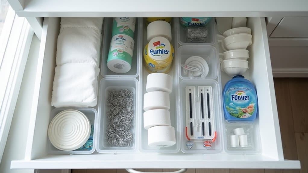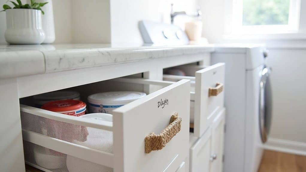 To implement drawer dividers effectively, start by decluttering the drawer and sorting items into categories, such as dryer sheets, stain removers, and measuring cups. Then, measure the drawer dimensions and choose dividers that fit snugly, whether they are expandable organizers or individual inserts. Place the most frequently used items in the easiest-to-reach sections, ensuring a functional and efficient setup for your laundry tasks.