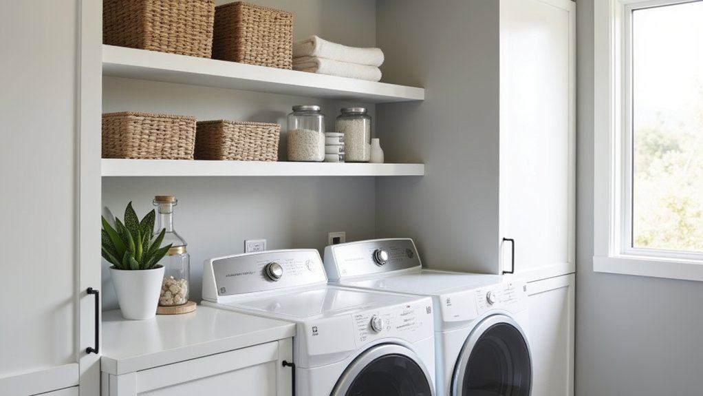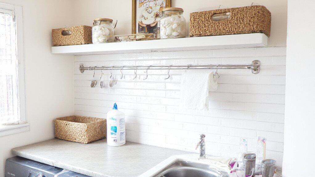 To install floating shelves, start by locating wall studs using a stud finder to guarantee a secure mount, then mark the desired height with a level for a straight installation. Use a drill to attach the shelf brackets or hardware to the studs, following the manufacturer’s instructions, and double-check that the shelves are securely in place before loading them with supplies. Organize items in labeled baskets or bins on the shelves to keep things tidy and easily accessible, grouping similar products together for quick retrieval during laundry tasks.