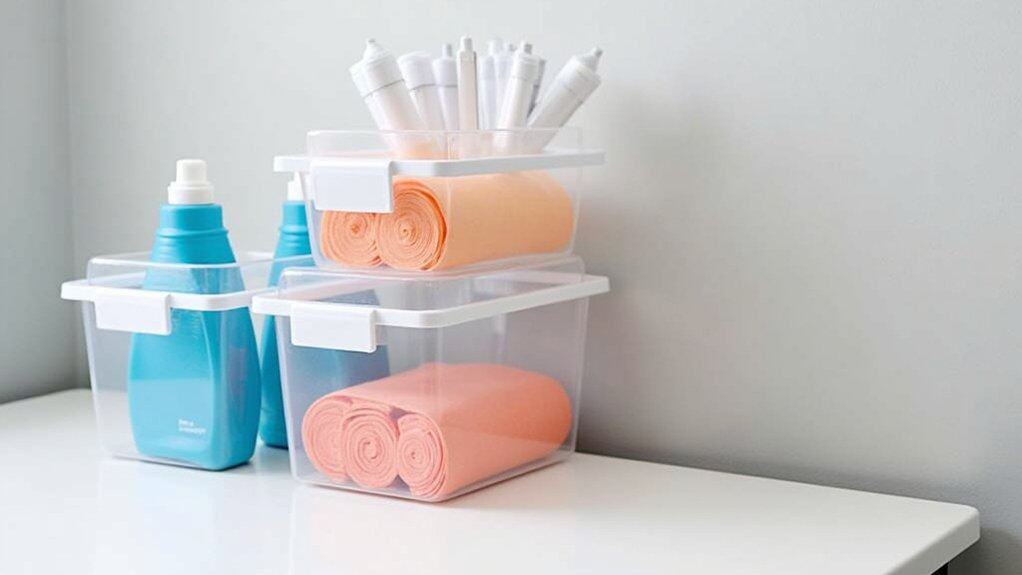 When setting up stackable storage bins, place heavier items in the lower bins to guarantee stability and prevent tipping, while lighter items like dryer sheets or sponges can go on top. Opt for bins with sturdy interlocking designs to create a secure stack that won’t topple over, and consider placing them on a shelf or in a corner to maximize floor space. Regularly declutter the bins to avoid overstuffing, keeping only frequently used items within easy reach for efficiency.