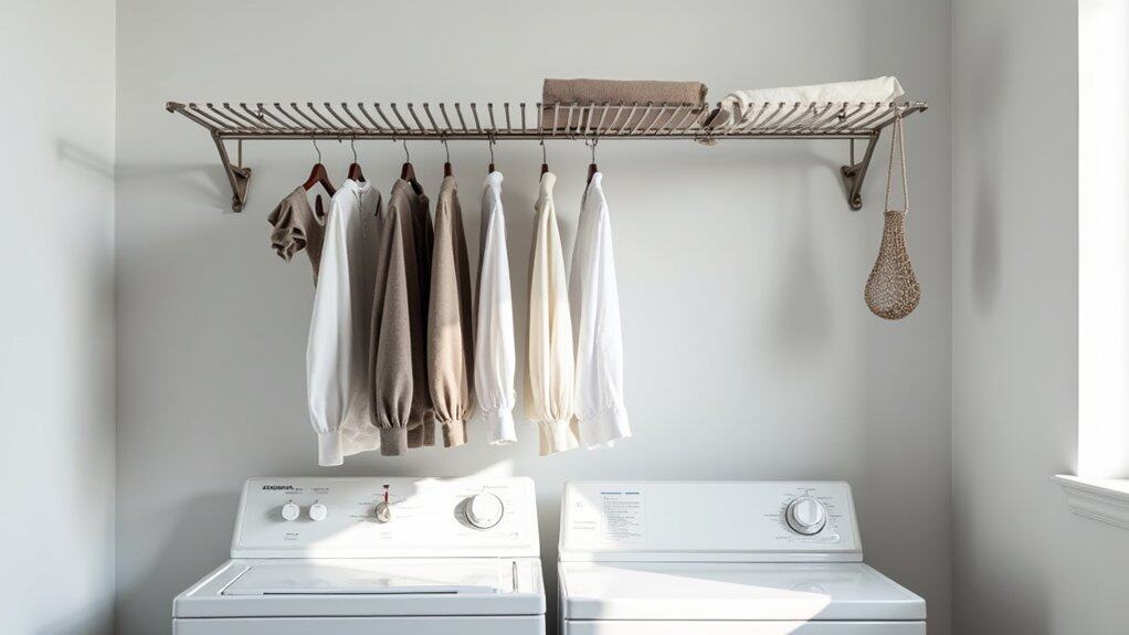 To organize with wall-mounted drying racks, start by categorizing items that need air-drying, such as lingerie, knitwear, or items with specific care instructions, and assign them a dedicated spot on the rack. Confirm the rack is securely installed at a height that’s easily accessible yet out of the way of daily activities. Adding small hooks or clips to the rack can help secure smaller items, preventing them from slipping off, and keep the drying area neat and functional.
