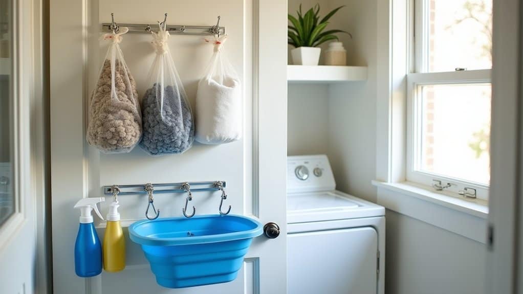 To organize effectively, group similar items together on the hooks, such as hanging all reusable dryer sheets in one spot or dedicating a hook to laundry detergent pods in a small mesh bag. Make certain that heavier items are placed on lower hooks to maintain balance and prevent the door from becoming top-heavy. Regularly declutter the hooks by removing items that are no longer needed to keep the space functional and accessible.
