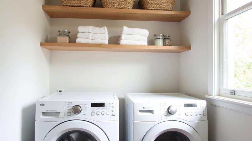 When organizing floating shelves, prioritize accessibility by placing frequently used items, such as detergent and dryer sheets, on the lower shelves for quick access. Use decorative baskets or labeled bins to keep smaller items like clothespins or stain removers tidy and visually appealing. Finally, reserve the higher shelves for less-used items or seasonal supplies to maintain a clutter-free and functional laundry space.