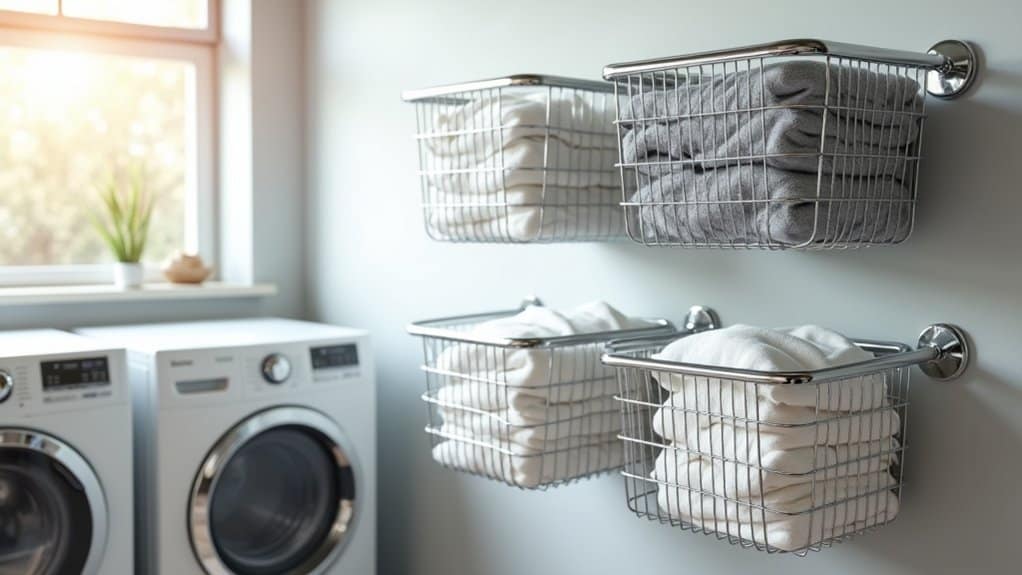 Choose baskets that fit your aesthetic and functional needs, such as wire or fabric options with sturdy frames for durability. If wall-mounting, make sure the baskets are securely fastened to studs or use heavy-duty anchors to support the weight of laundry. For stackable units, opt for designs with locking mechanisms or stable bases to prevent tipping, and label each basket for easy sorting of whites, colors, and delicates.