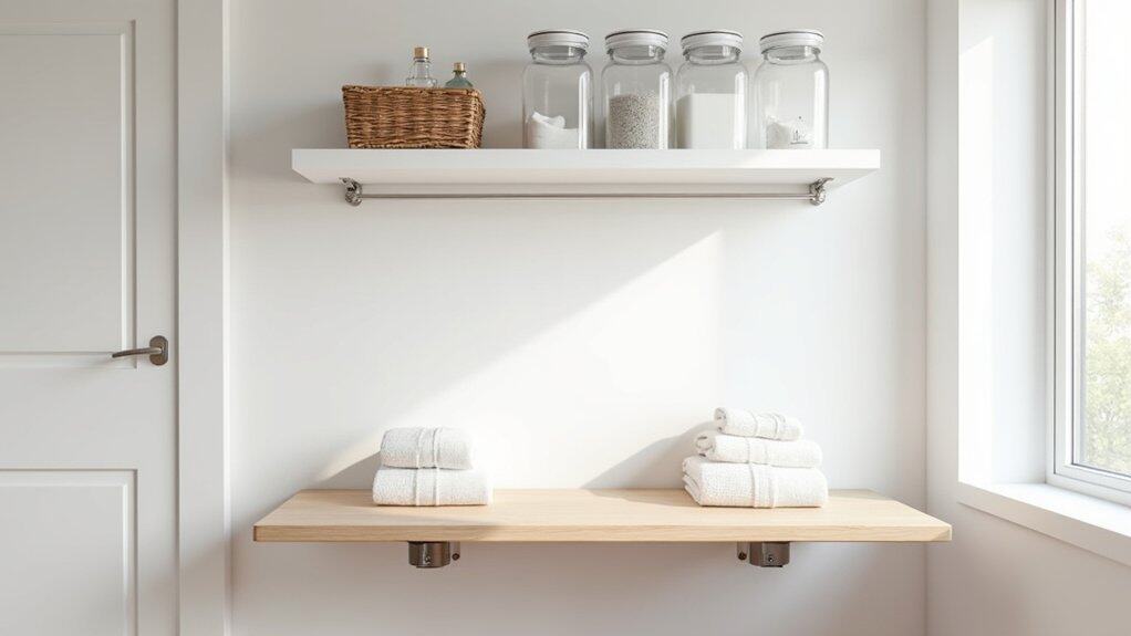A wall-mounted folding station is an excellent way to maximize space in a small laundry room while keeping your folding area organized and accessible. Start by selecting a sturdy, fold-down table or shelf that can be mounted at a comfortable height for folding clothes. Ascertain the station is installed securely into wall studs to handle the weight of laundry and avoid clutter by storing folding essentials like detergent pods or fabric softener sheets in nearby wall-mounted baskets or shelves.