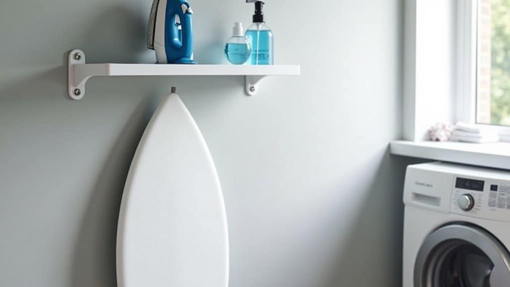 Keep the area around the wall-mounted ironing board clutter-free by adding nearby storage for ironing essentials like spray bottles, starch, and the iron itself. Consider installing a small shelf or wall-mounted organizer above or beside the board to hold these items within arm’s reach. This setup not only maintains a tidy space but also streamlines the ironing process, making it more efficient and hassle-free.
