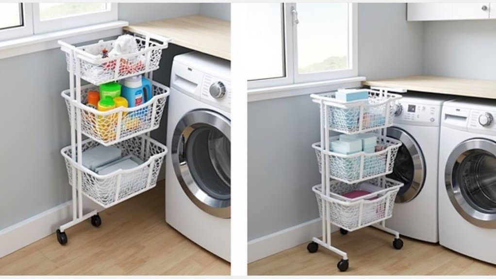 To organize the cart effectively, categorize items using baskets or bins within the cart for separating detergents, fabric softeners, and dryer sheets, keeping everything neatly contained. Utilize the cart’s mobility by rolling it close to the washer and dryer during laundry tasks, then mount it back on the wall to save space when done. Regularly declutter the cart by removing empty containers or outdated products to maintain an efficient and tidy setup.
