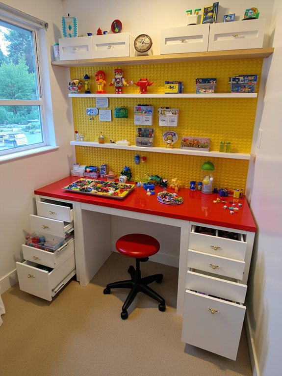 A Lego block drawing desk transforms a standard workspace into an interactive creative station. By incorporating classic Lego design elements like colorful drawers with stud-like knobs and a baseplate surface, the desk becomes both functional and playful.
