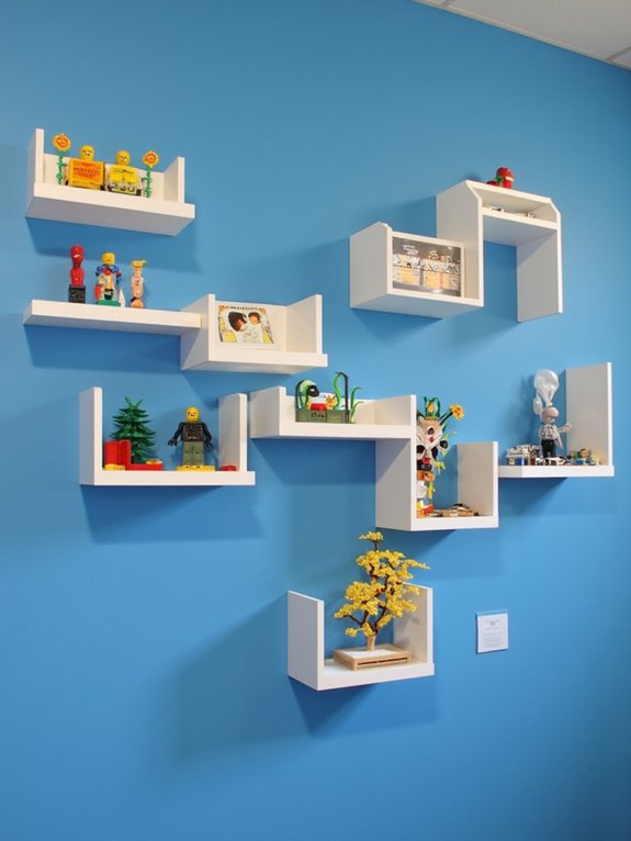 The shelves can be customized with coordinating colors, varied heights, and integrated lighting to showcase builds effectively. Adding baseplates to shelf surfaces ensures models remain secure, while proper spacing between units creates an organized and visually appealing display that keeps precious creations safely above floor level.