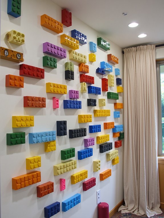 The creation process involves careful planning on graph paper, measuring the wall space, and painting rectangular “bricks” in authentic proportions using painter’s tape for clean edges. Base colors are applied first, followed by individual brick details in traditional Lego shades of red, yellow, blue, and green.