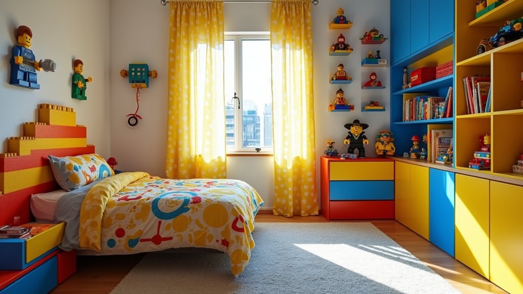 Lego-themed floating shelves offer an elegant storage solution for displaying brick creations while maximizing bedroom space. These wall-mounted units combine practicality with playful design elements that complement any Lego enthusiast’s room decor.
