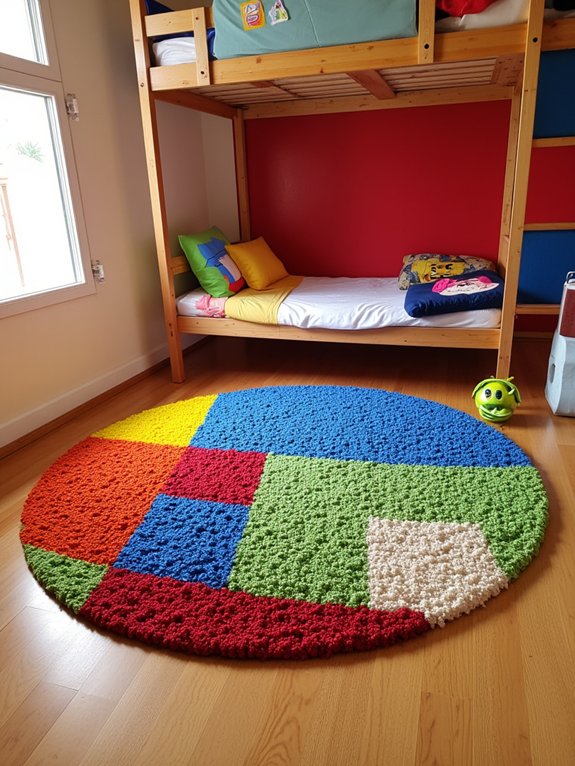 A Lego-themed shag area rug serves as both a decorative centerpiece and functional play surface for any brick-building enthusiast’s room. The plush, high-pile texture provides comfort during floor activities while incorporating classic Lego colors like red, yellow, blue, and green to complement existing decor.
