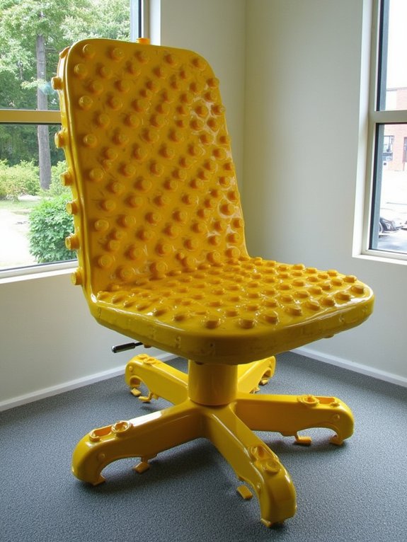 A desk chair designed to look like an oversized Lego block combines playful aesthetics with practical seating. The chair features adjustable height settings, ergonomic support, and comes in classic Lego colors like red, yellow, blue, and green to complement themed rooms.