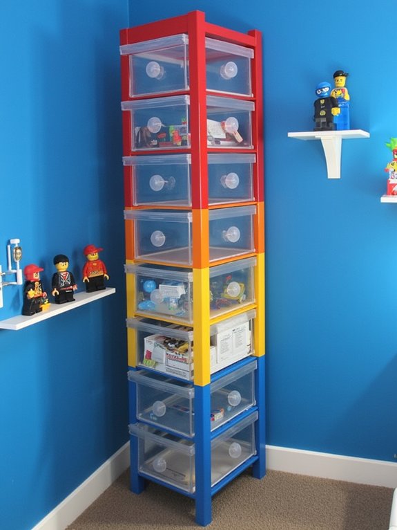 Lego-themed toy storage towers combine playful design with practical organization, featuring containers shaped like oversized Lego bricks. These storage units help transform children’s rooms while making cleanup an enjoyable experience. The towers include sliding drawers that can accommodate large quantities of Lego pieces, with customizable labeling options for easy sorting.