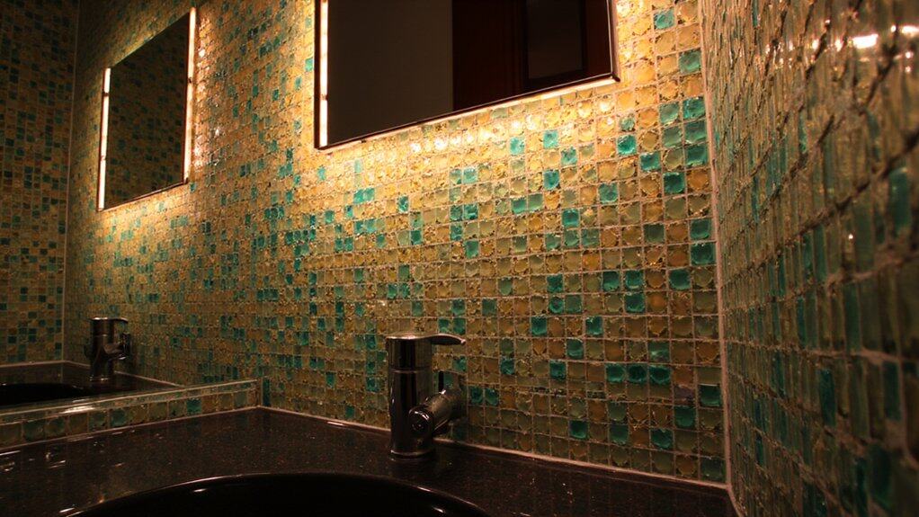As you explore unique lighting for your powder room, consider artistic mosaic light tiles for a stunning effect. These tiles, often 12×12 inches, combine glass and ceramic for a shimmering glow when lit from behind. Install them as a backsplash or accent wall within 2-3 hours for impact.
