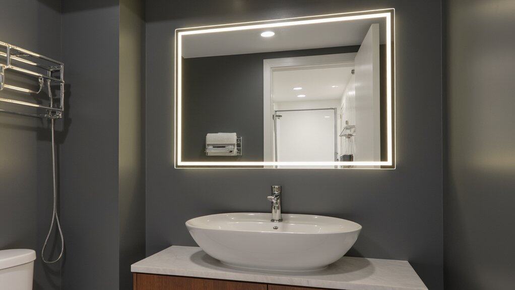 Elegance shines through with chic mirror backlighting, transforming your powder room into a polished space. You’ll love how it adds a soft, modern glow, making your mirror pop. Install LED strips behind a 24×36-inch mirror for even light distribution, taking about 2 hours.