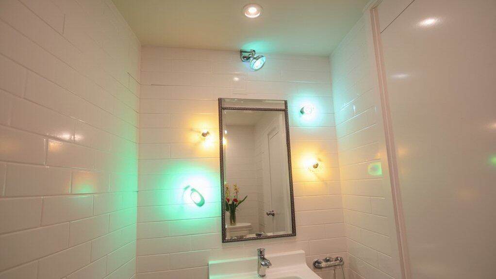 Why not brighten your powder room with colorful accent spotlights for a bold, vibrant touch? These focused beams, often 3-5 watts, can transform a small space in under an hour. Install them above mirrors or corners for maximum effect.